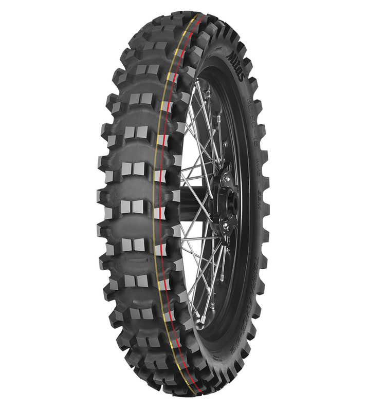 SOFT MEDIUM TERRAIN - Identified by the characteristic red + yellow stripe: Motocross competition tire made from a medium hard tread compound for soft to medium terrain.