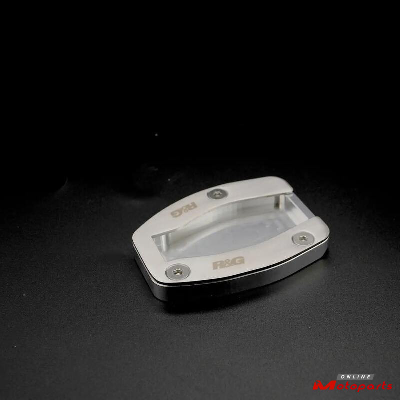 R&G Racing Kickstand Shoes bolt onto the bottom of the sidestand, to enlarge the original’s footprint by up to 100%, significantly spreading the load placed upon it, to help prevent the stand ‘piercing’ the ground. Despite this enlargement, the Shoe does not affect ground clearance or interfere with the chain run during normal riding.