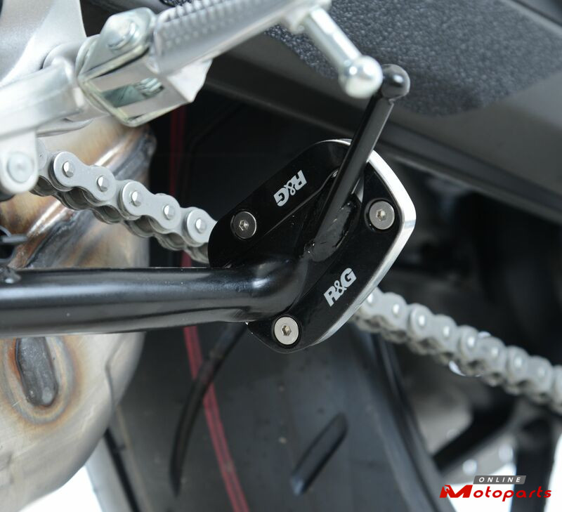 R&G Racing Kickstand Shoes bolt onto the bottom of the sidestand, to enlarge the originalâs footprint by up to 100%, significantly spreading the load placed upon it, to help prevent the stand âpiercingâ the ground. Despite this enlargement, the Shoe does not affect ground clearance or interfere with the chain run during normal riding.