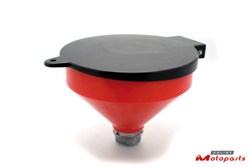 Funnel polyethylene Ã250mm with lid to be installed atop a standard barrel for waste oil or chemical disposal.