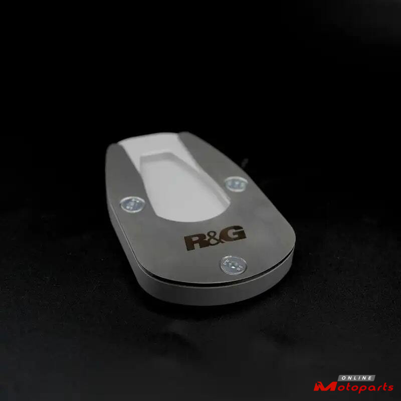 R&G Racing Kickstand Shoes bolt onto the bottom of the sidestand, to enlarge the originals footprint by up to 100%, significantly spreading the load placed upon it, to help prevent the stand piercing the ground. Despite this enlargement, the Shoe does not affect ground clearance or interfere with the chain run during normal riding.