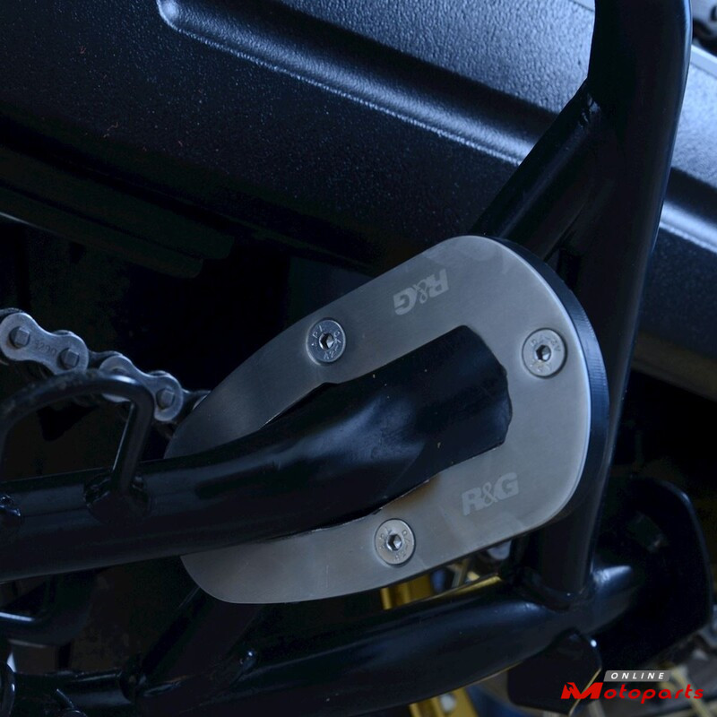 R&G Racing Kickstand Shoes bolt onto the bottom of the sidestand, to enlarge the original’s footprint by up to 100%, significantly spreading the load placed upon it, to help prevent the stand ‘piercing’ the ground. Despite this enlargement, the Shoe does not affect ground clearance or interfere with the chain run during normal riding.