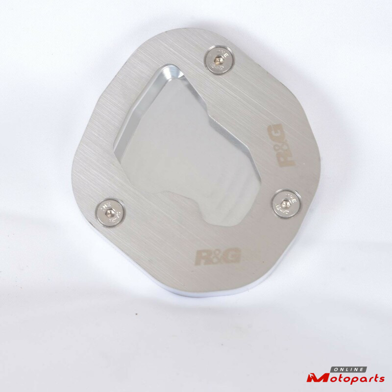 R&G Racing Kickstand Shoes bolt onto the bottom of the sidestand, to enlarge the originals footprint by up to 100%, significantly spreading the load placed upon it, to help prevent the stand piercing the ground. Despite this enlargement, the Shoe does not affect ground clearance or interfere with the chain run during normal riding.