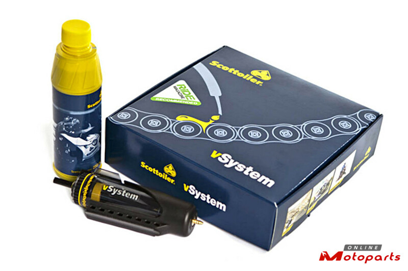 The vSystem kit is a vacuum-operated motorcycle chain oiler, which automatically lubes your chain while you ride. Scottoiler chain oiler system spouts oil drops on chain rings, directly through a mounted dispenser. The spread amount of oil will lube the whole chain through capillary action and avoid tyre pollution thanks to an adaptated amount of 1 drop/mn.