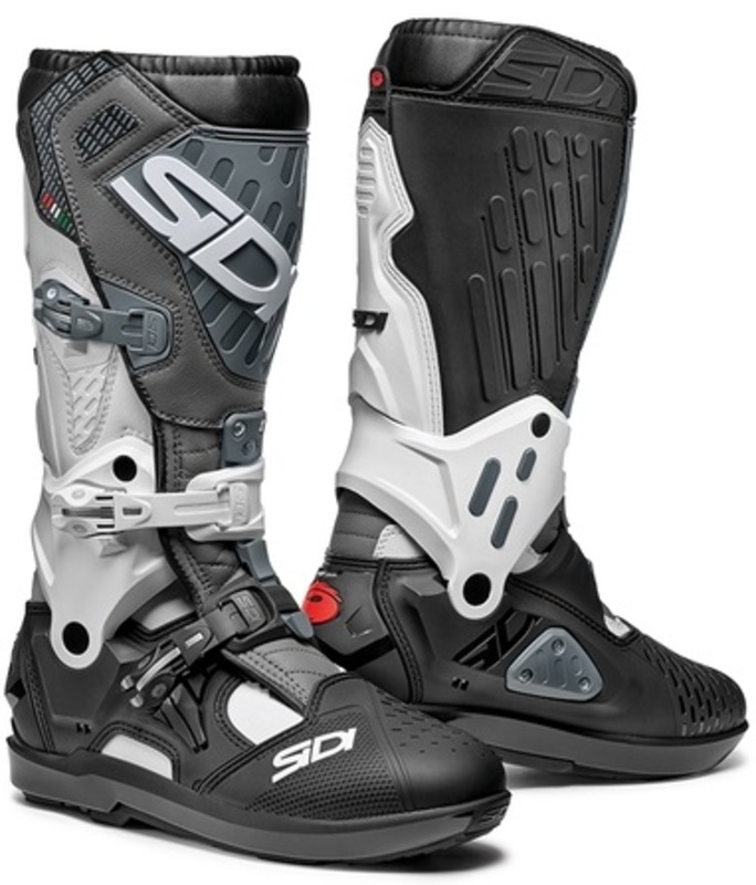 The SRS (Sole Replacement System) interchangeable sole has an innovative design and a revolutionary replacement system. Design and technology are patented by Sidi. The base of the soles, or boat, features a more aggressive look and is slightly higher for greater engagement with the upper. The tip and heel are fixed, while the central part, subject to greater wear, is replaceable. The tip has a special design with traction grooves for greater grip, also ideal for Enduro. The heel area has a fixed insert in soft PU that makes the boot more stable and offers increased traction against the bike. The central part of the sole is made of a rubber insert studied with a new interlocking Dovetail system and 4 screws for easy replacement. Functional design for motocross.