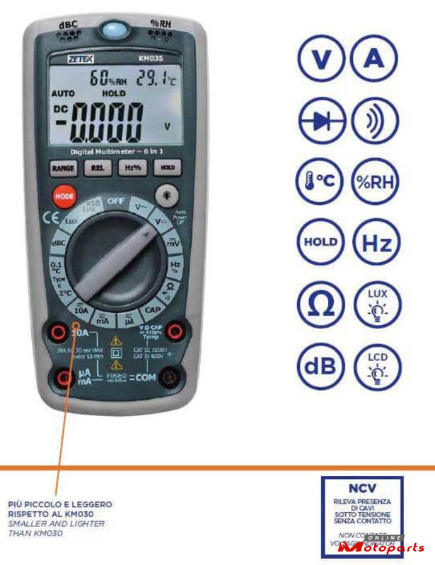 Professional digital multimeter including all functions for service and motorbikes diagnostic.