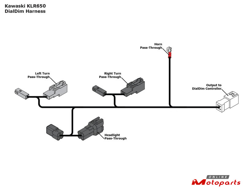 This wiring adapter enables plug-&-play connection between our standard DialDim Lighting Controller and the Gen3 Kawasaki KLR 650. To install, simply connect the white connector to our DialDim Controller and the remaining connectors in line at the KLR 650 headlight, horn, and turn signal connectors.