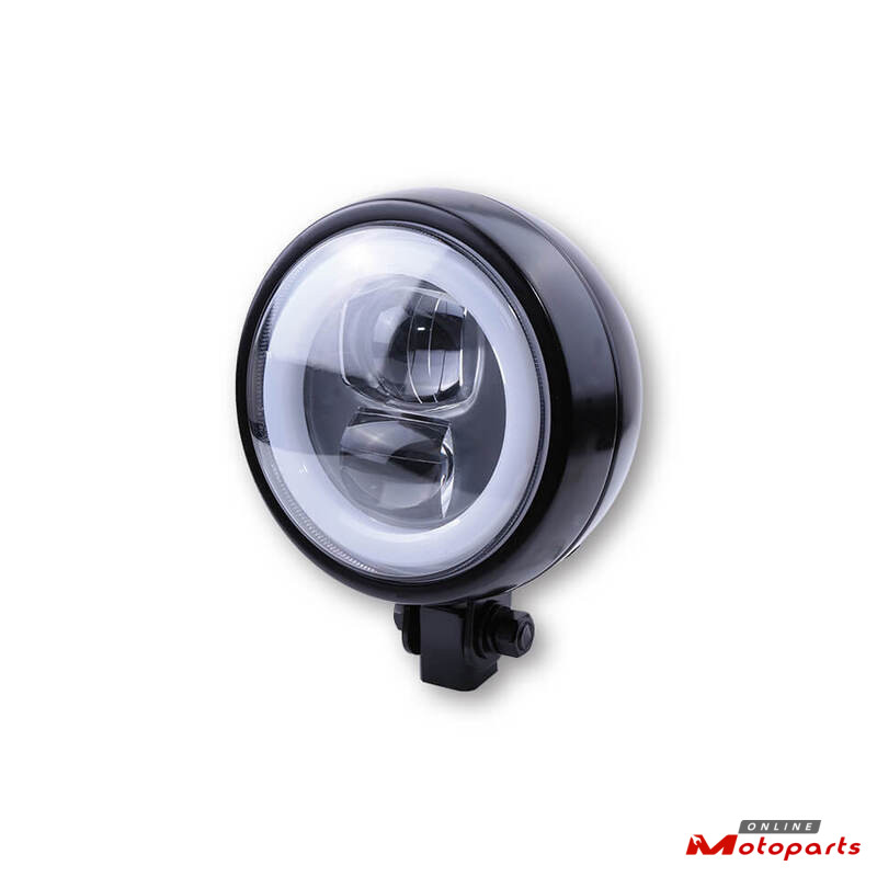 With its compact 4 3/4 inch size, the LED headlight FLAT TYPE 9 cuts a fine figure on your bike. Smallbut still robust. Powerful LED technology solidly packed in a steel housing with round shape and flat back. Tested main headlamp with high beam, low beam and parking light function.The dipped beam is at the bottom and the main beam at the top. The LED parking light is ring-shaped and encloses the reflector, forming a ring of light. The FLAT TYPE 9 is optionally available with Fixing points at the bottom or sides and in different colours.