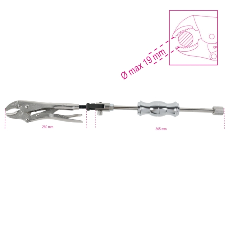 The self-locking pliers with 1 kg sliding hammer face is ideal for pulling stud bolts, broken screws and sheets, especially in the car repair industry.