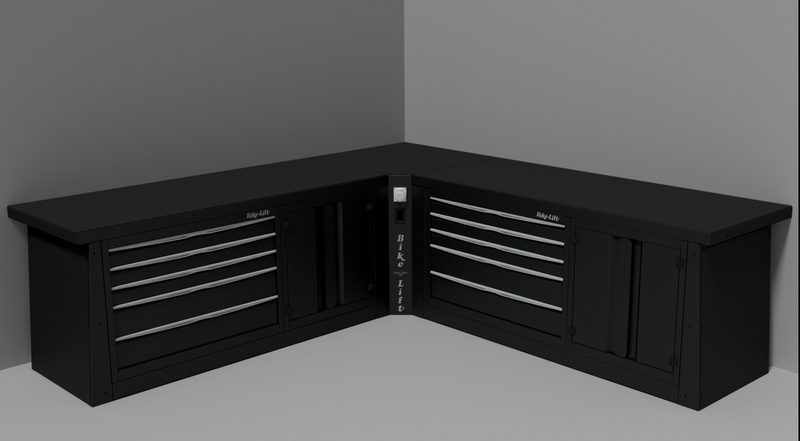 The air / electric corner unit assembles two Bike Lift workshop furniture (89080002, 89080003, 89080004) for an L-shaped configuration.