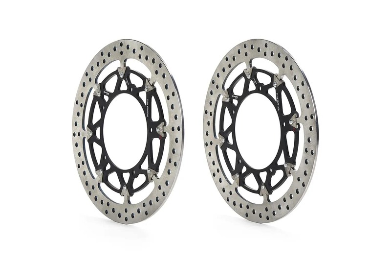 The T-Drive disc, based on experience gained in MotoGP and Superbike events, has an innovative coupling between the rotor and the bell consisting of eight T-shaped pins machined into the disc and eight outlines on the bell, thereby allowing the elimination of drive pawls. A specific study of tolerances shows that this configuration achieves not only a significant weight reduction but also both axial and radial floating capable of transmitting more braking torque.