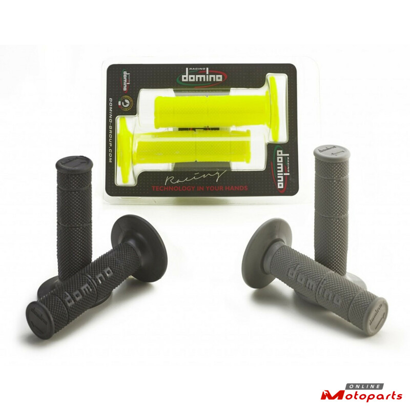 Domino introduces the new 6131 grip, specially developed for offroad bikes in black, grey and yellow fluo colours. It has Domino typical "multicuspide" surface finish with differentiated diameter on all the cylindrical area and closed end. This special solution, combinated with the ultra-thin thickness of the soft material, allows the rider a perfect and safe ergonomic grip in any condition.