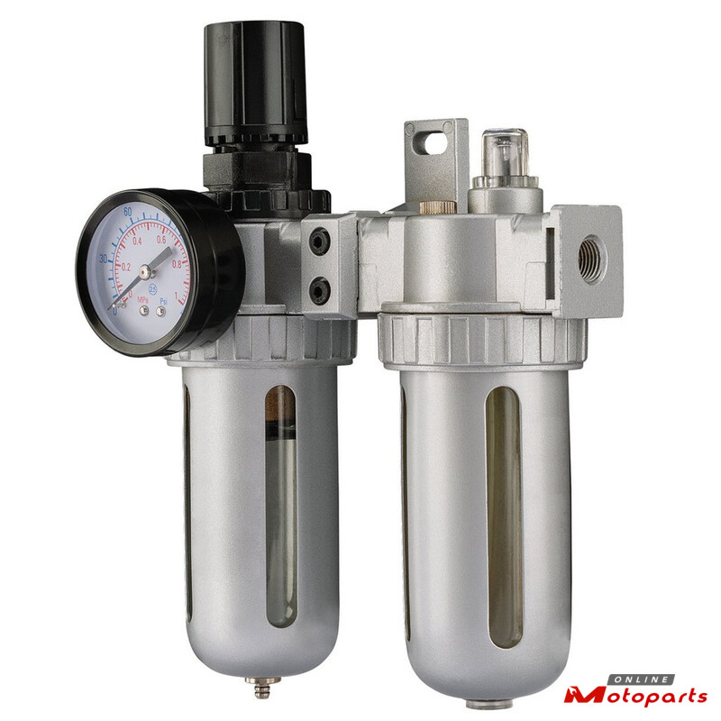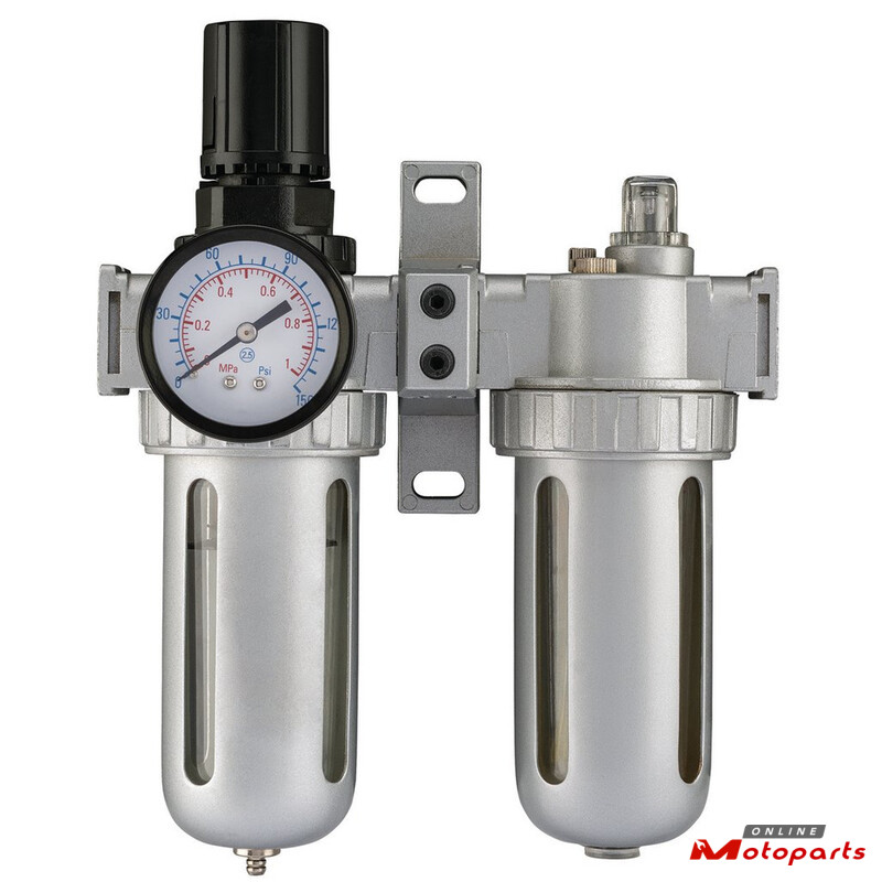 Designed to control output air pressure, eliminate moisture and contaminants from airflow and to lubricate tools during use. The main body of this unit is aluminium with polished silver finish. The gauge has steel casing and is duel-marked with psi and Mpa. Steel screw-on transparent bowl. Manual/semi-automatic drain, fitted with 40-micron filter. Complete with wall bracket.