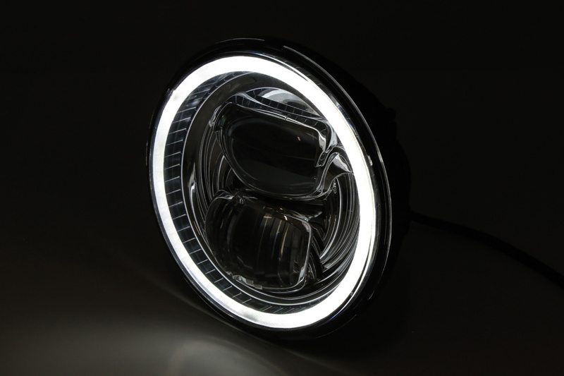 This round, black or chrome reflector has high beam, low beam and parking light ring. The low beam is illuminated in the upper half of the insert and when the high beam is switched on, both halves are illuminated.