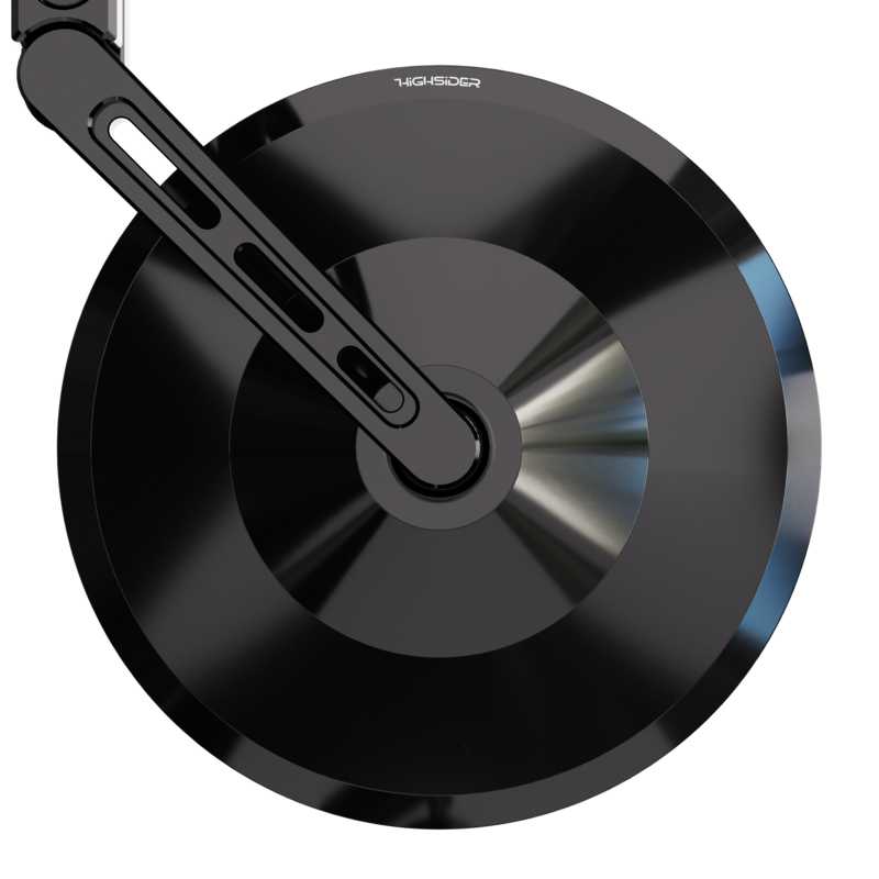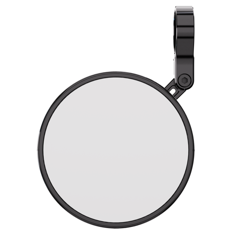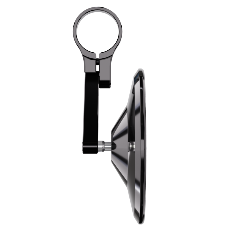 Universal handlebar end mirror, noble design, with a round head made of black anodized aluminum. In the second generation of the popular HIGHSIDER pro MONTANA handlebar end mirror, the mirror arm has been changed in length and shape. The mirror arm has three stylish air vents and is shorter than the first generation. A hinge on the clamp provides additional adjustment for better visibility.