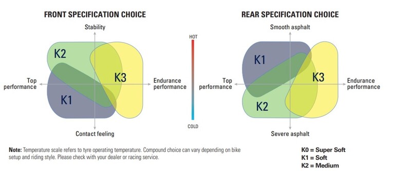 Thanks to RACETEC™ RR distinctive versatility of use on a wide range of asphalts and temperatures, the front tyre compound choice should be primarly made on rider’s preferences between higher stability and precision when entering the corner (K2 version) rather than predictability and “edge grip” feeling (K1 version).
