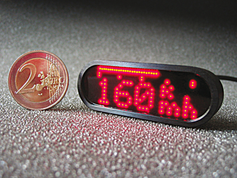 The innovative dot matrix of 251 ultra-bright LEDs displays the speed by a scalable, horizontal strip light and all other functions as a numerical value easily detectable. The speed can also be called up as a numerical value at the push of a button. In order to achieve optimum readability in darkness, sun and twilight, the luminosity of the LEDs is automatically adjusted. For the limit range of the permissible speed ('red range') or as a switching flash function, a speed value can be entered which, if exceeded, causes all LEDs to light up pulsating simultaneously.