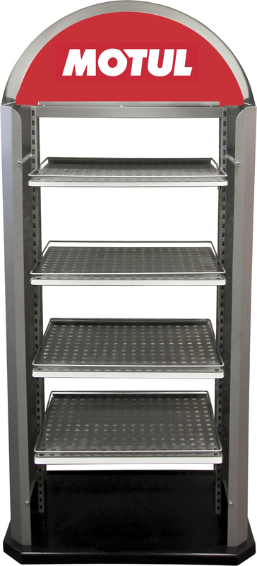 Sales shelf Vision II with 4 trays adjustable in height. For The présentation of engine oils, maintenance and care products. solid metal construction. Scanner rails and one top sign included.