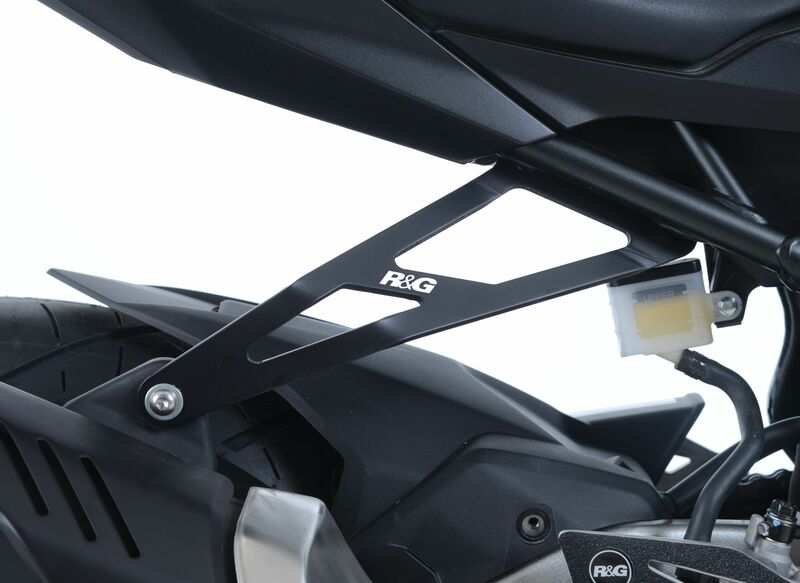 R&G Racing exhaust hangers give the bike a racing look by ditching pillion pegs.