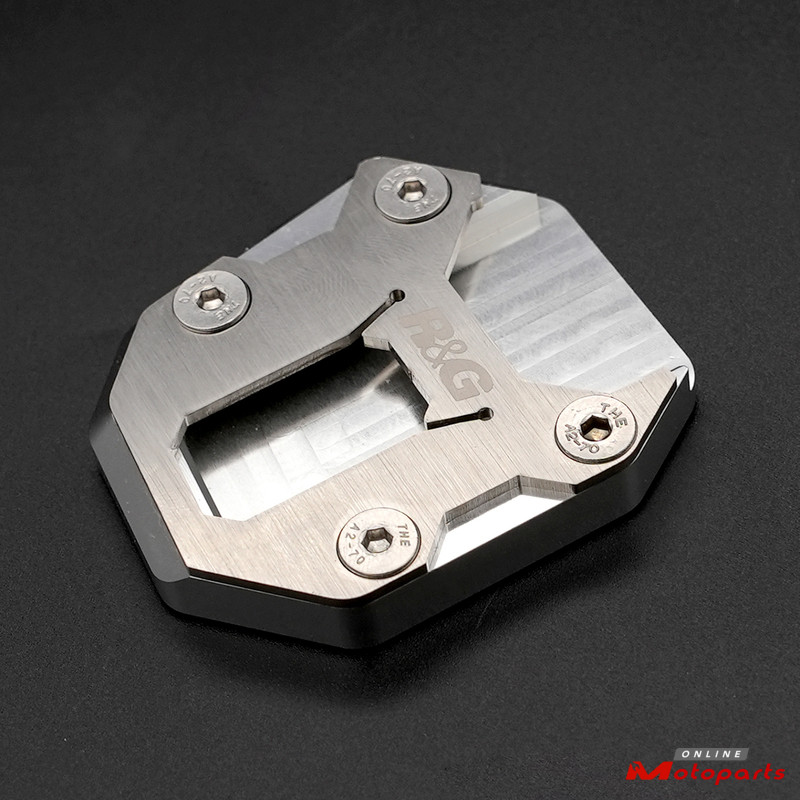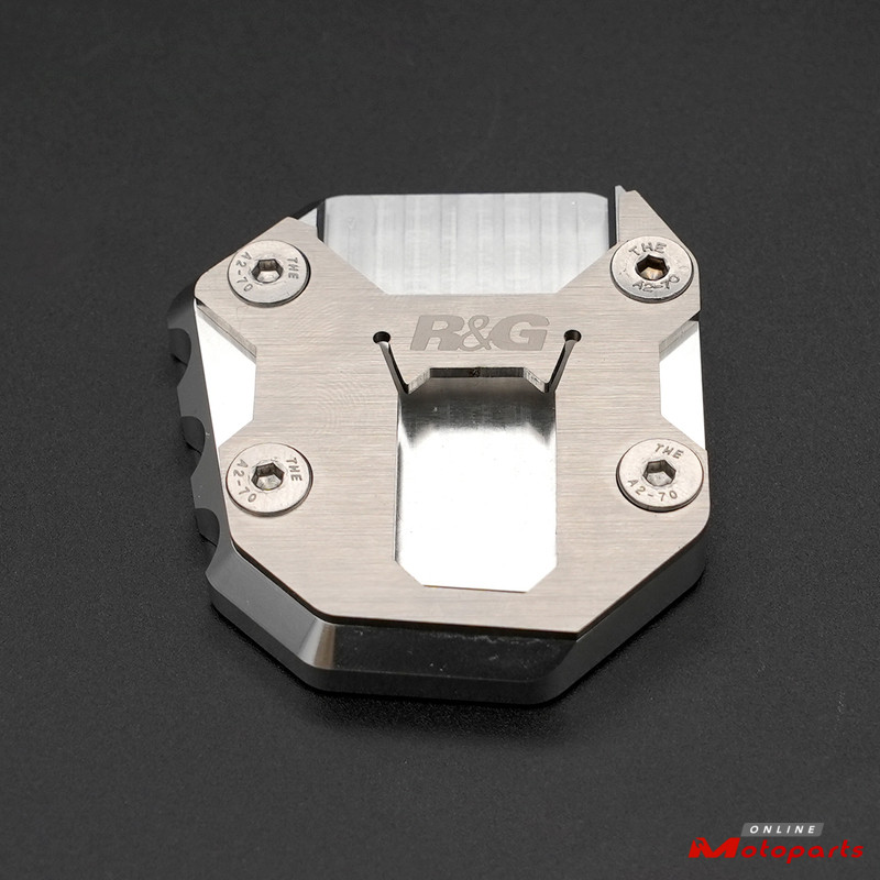 The side stand shoe R&G doubles the surface area of the stand platform that touches the ground, and is intended to be mounted permanently. It increases the stability of the motorbike on its stand, especially on loose surfaces.