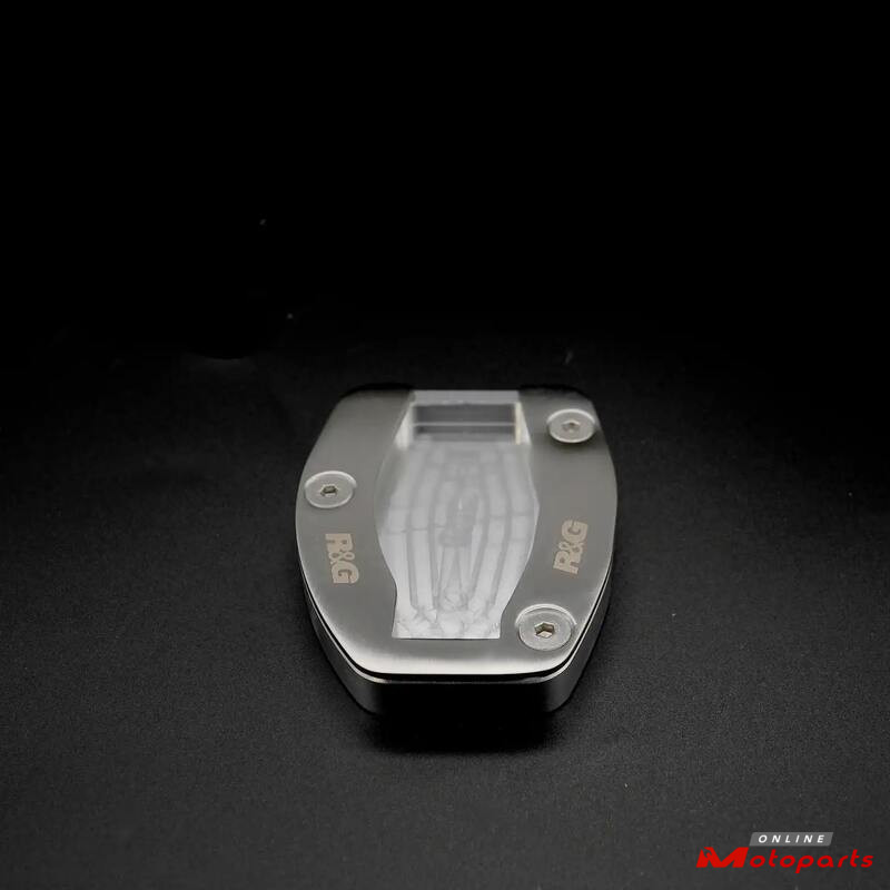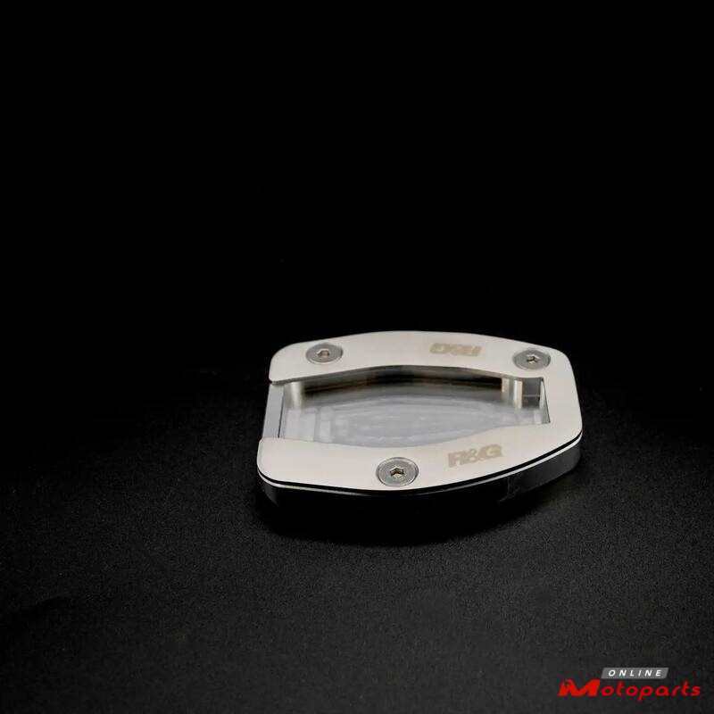 R&G Racing Kickstand Shoes bolt onto the bottom of the sidestand, to enlarge the original’s footprint by up to 100%, significantly spreading the load placed upon it, to help prevent the stand ‘piercing’ the ground. Despite this enlargement, the Shoe does not affect ground clearance or interfere with the chain run during normal riding.