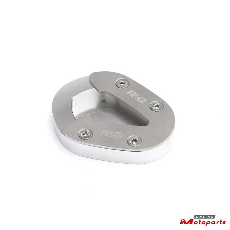 R&G Racing Kickstand Shoes bolt onto the bottom of the sidestand, to enlarge the original’s footprint by up to 100%, significantly spreading the load placed upon it, to help prevent the stand ‘piercing’ the ground. Despite this enlargement, the Shoe does not affect ground clearance or interfere with the chain run during normal riding.