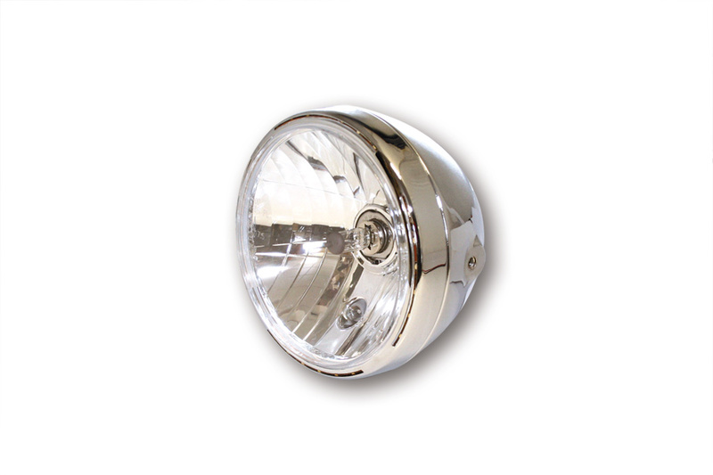 SHIN YO Reno 2 7 inch main headlight with Led position light in lamp ring. H4 prism reflector in black or chRome metal housing with M8 side mounting. E-examined.
