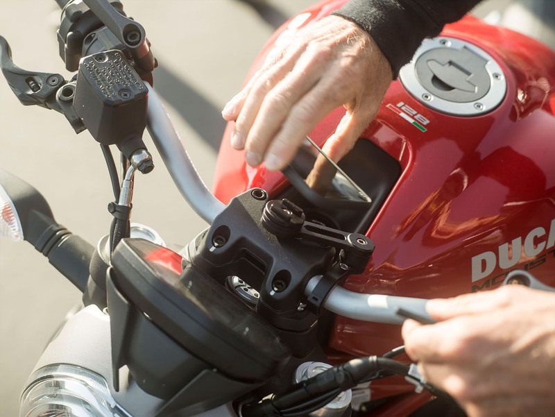 Fasten the MOTO MOUNT PRO to the handlebars of your motorcycle and you are ready to mount the SP ConnectTM PHONE CASE(or UNIVERSAL INTERFACE) by placing it on the mount and turning it 90° clockwise. To further protect your smartphone the mount also has a unique vibration dampening system that cuts G-forces by up to 40% (depending on bike & phone model).
