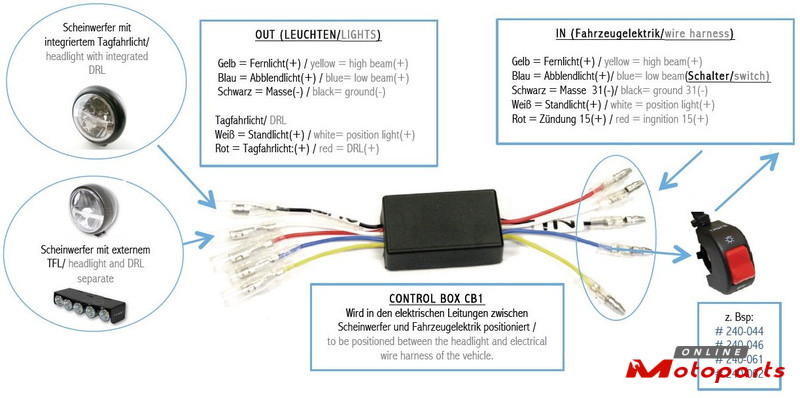 A separate ON and OFF switch for the DRL CONTROL-BOX is also required (not included).