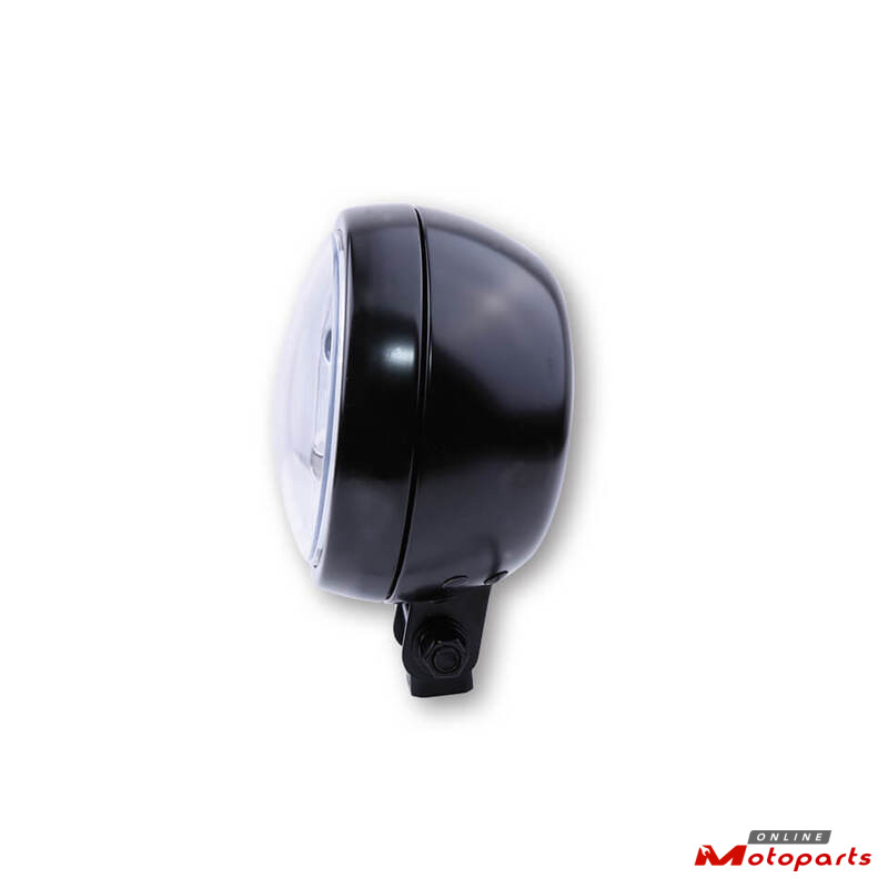 With its compact 4 3/4 inch size, the LED headlight FLAT TYPE 9 cuts a fine figure on your bike. Smallbut still robust. Powerful LED technology solidly packed in a steel housing with round shape and flat back. Tested main headlamp with high beam, low beam and parking light function.The dipped beam is at the bottom and the main beam at the top. The LED parking light is ring-shaped and encloses the reflector, forming a ring of light. The FLAT TYPE 9 is optionally available with Fixing points at the bottom or sides and in different colours.