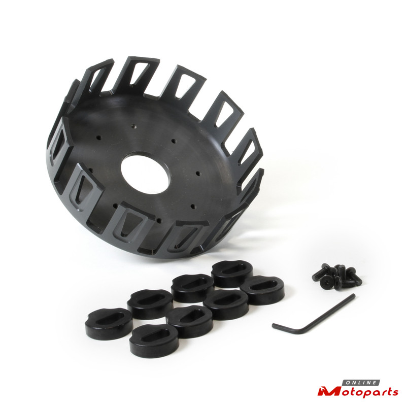 The special added Teflon coating seals the coating to create a near frictionless surface for the clutch plate tabs to glide upon. All our clutch baskets comes with pre-applied thread locker fasteners and an inbus tool.