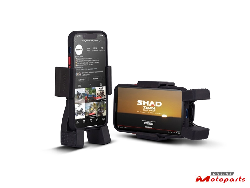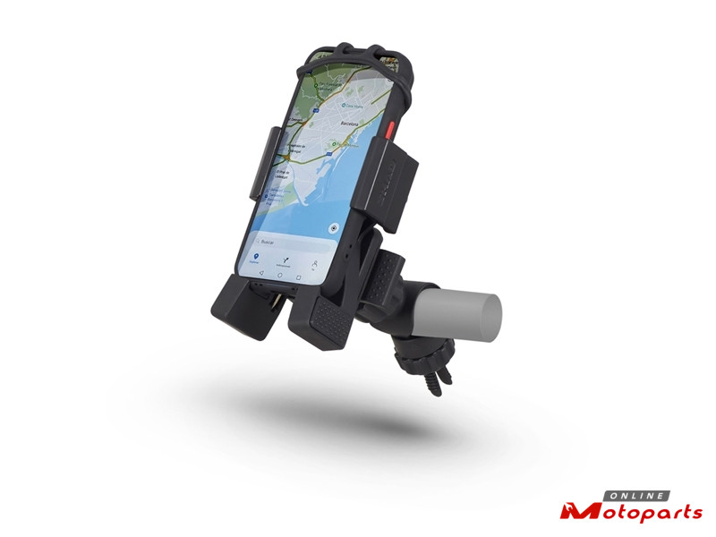 Smartphone holder compatible with all motorcycles. It allows to quickly adjust the phone, being completely available to use, whatever its size (from 135x65mm to 180x90mm). Quick and easy to install to the handlebar, thanks to its universal mounting system (SHAD Quick Click System), adjustable even with gloves. Rubber grips hold the smartphone and avoid slipping. Safety tether and strap included.