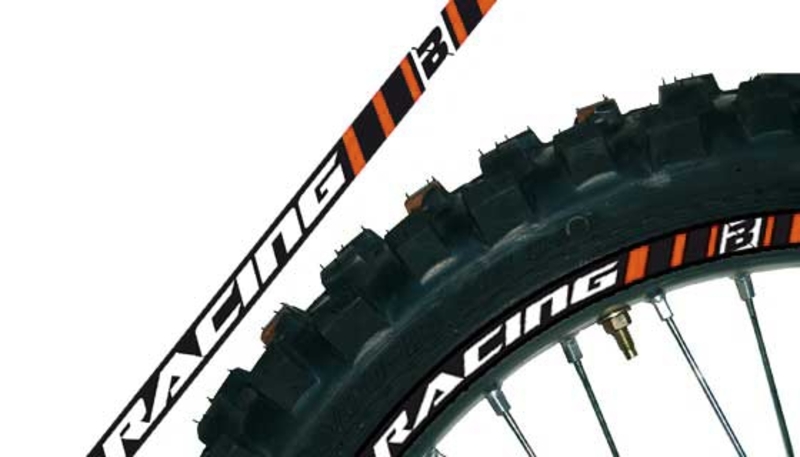 The kit is composed of 8 front rim stickers and 8 rear rim stickers, plus 2 spare parts. It allows to decorate the rim side with adhesive stripes specifically shaped. It can be applied on 17'', 18'', 19'' and 21'' rims. For minicross, the stickers need to be cut at the ends in order to adapt them to the lower diameter of the rims.