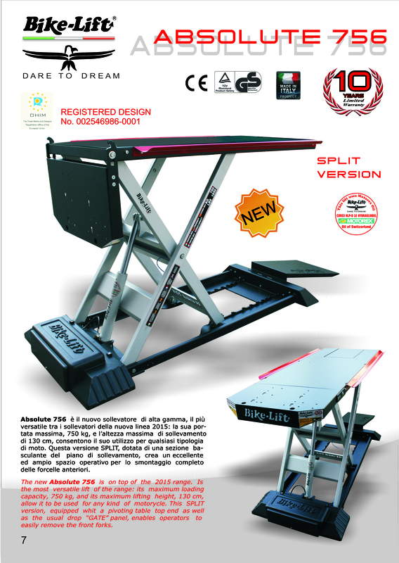 The lift table ABSOLUTE 756 Split is specially designed for heavier bikes. Capable of lifting up to 750 kg at a height of 1.30 meters, it is equipped with a front & rear sliding trap gate that provide easy access to the wheel for easy operation. With a steel structure extremely strong and stable, it offers working comfort increased work safely.