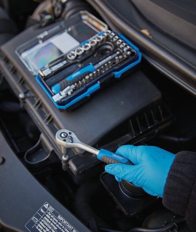 This 1/4" Sq. Dr. socket set includes a 146mm 72-tooth reversible quick-release ratchet, plus a selection of sockets, screwdriver bits and hex keys. All of the tools in this set are manufactured from chrome vanadium steel. The 6-point sockets and extension bar have a knurled finish for extra grip. The ratchet and spinner both have a soft grip for added comfort during prolonged use. Supplied inside a sturdy plastic storage case.