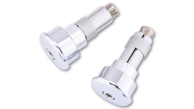 Bar End Weights made of chrome-plated or black aluminium with chrome-plated or black central screw. Universal fit for handlebars withInner diameter from 12 to 22 mm – therefore for most 7/8 inch and 1 inch aluminium or steel handlebars. All hanging bar end mirrors of the brand HIGHSIDER pro and SHIN YO can be mounted with external clamps.