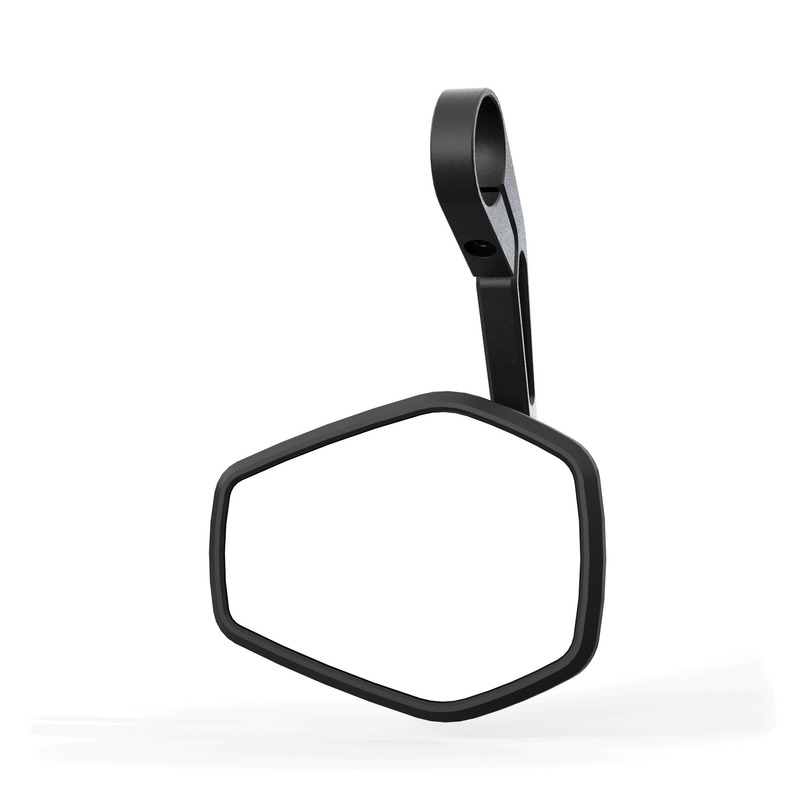 Rising and flat trapezoids create the futuristic design of the HIGHSIDER pro ESAGANO-RS mirror series, which thus picks up the design language of modern motorcycles. The base body of the mirror head, made of high-quality plastic, encloses the distinctive inlay, which is CNC machined from aluminum. This symbolizes the design language of the ESAGANO product family and creates a unique recognition value with the rising and flat tapered geometries. The bead-blasted and matte black anodized surface of the aluminum contrasts with the surface of the mirror head, completing the image. The long handlebar end stem in aluminum embodies design and function. In this way, the forces acting on the mirror during travel are dissipated particularly effectively via binomial structures using tension and compression points. At the same time, this structure reduces the weight of the mirror stem and also creates a visually harmonious overall appearance. The handlebar end mirror can be mounted both standing and hanging on the handlebar. The mirror is mounted using the optically matching handlebar weight ESAGANO-LS with 12mm stem mount or a handlebar weight in an alternative design from our product range. If there is sufficient space, the mirror can also be attached directly to the handlebars via the supplied aluminum adapter rings
