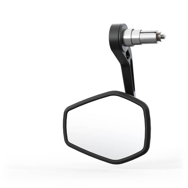 Rising and flat trapezoids create the futuristic design of the HIGHSIDER pro ESAGANO-RS mirror series, which thus picks up on the design language of modern motorbikes. The basic body of the mirror head is made of high-quality plastic and encloses the distinctive inlay, which is CNC-manufactured from aluminium. This symbolises the design language of the ESAGANO product family and creates a unique recognition value with its rising and flat geometries. The pearl-blasted and matt black anodised surface of the aluminium contrasts with the surface of the mirror head and completes the picture. The long handlebar end stem in aluminium embodies design and function. For example, the forces acting on the mirror during the ride are dissipated particularly effectively via binomial structures through traction and pressure points. At the same time, this structure reduces the weight of the mirror stem and creates a visually harmonious overall appearance. Thanks to our proven EVO mounting system, the installation is plug and play directly on the handlebar. No additional handlebar weight / accessories are needed to mount the mirror on the handlebar! The handlebar end mirror can be mounted either standing or hanging on the handlebar.