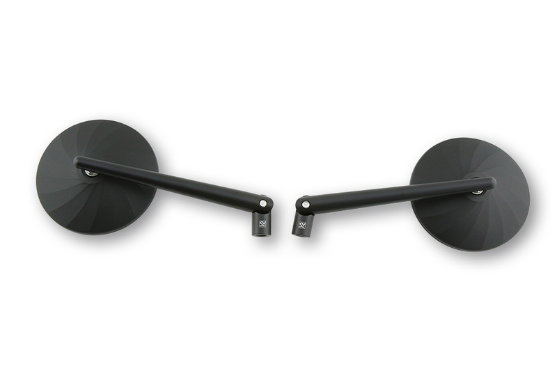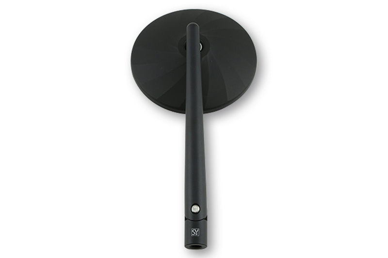 Universal mirror with a round plastic head and adjustable stem. Thanks to the use of a second joint on the handle, there are additional adjustment possibilities for your safety. The stylized turbine design on the back of the mirror head gives the HIGHSIDER smart PONZA handlebar mirror a further highlight.