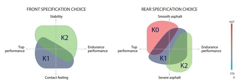As for the rear tyre, choice of version is based on asphalt friction coefficient (high severity/friction and low severity/friction, depending on the circuit or road race) and asphalt temperature (with the threshold being around 25°/30°degree).
