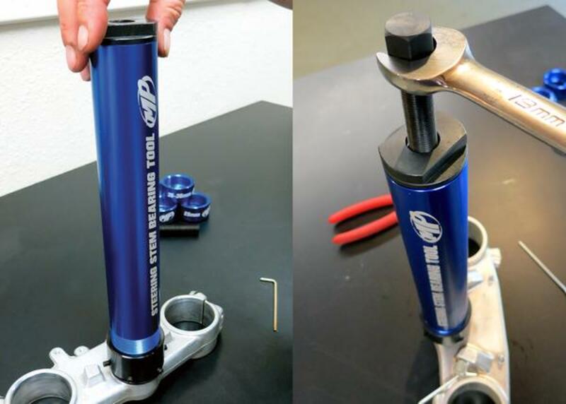 Design to removes and installs tapered roller bearing at base of steering stem. Fits most motorcycles with tapered roller bearing at base of steering stem.