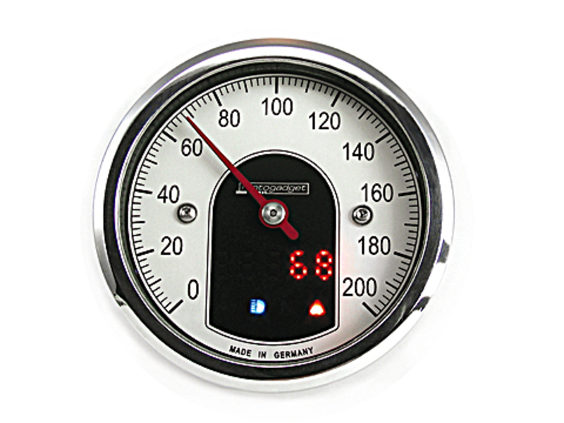 The detailed mounting and operating instructions (see Downloads) make the connection of the instrument also possible for users who have previously kept away from the vehicle electrics. The included speedometer sensor made of stainless steel is very small (M5/23 mm) and easy to hide. With the 1.5 m long connection cable, it can be easily attached to the front or rear wheel. Thus also vehicles with original mechanical speedo drive can be easily converted. The motoscope tiny is compatible with many original speedo sensors (reed contact and proximity sensors) of the vehicle manufacturers. In this case, only connections are connected and the mechanical installation of a sensor becomes completely superfluous. An intelligent 'Teach function' enables easy calibration of the speedometer - even on vehicles with sensors on the transmission, e.g. Harley-Davidson (TM).