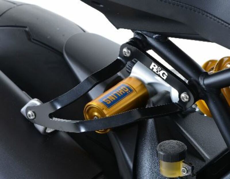 R&G Racing exhaust hangers give the bike a racing look by ditching pillion pegs.