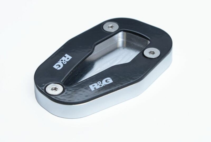 Kickstand Shoes bolt onto the bottom of the sidestand, to enlarge the original’s footprint by up to 100%, significantly spreading the load placed upon it, to help prevent the stand ‘piercing’ the ground. Despite this enlargement, the Shoe does not affect ground clearance or interfere with the chain run during normal riding.