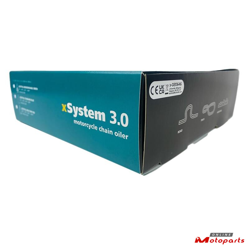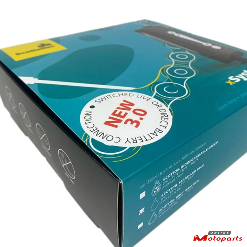 The xSystem 3.0 chain oiler kit includes the new and improved xSystem 3.0 unit with updated hardware and software, a 250ml bottle of Scottoil of your choice with over four refills, hoses, clips, a set of installation instructions, and a user manual.