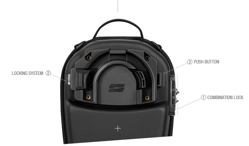 As well as being easy to use and easy to integrate into the motorbike, it features a push button that allows the bag to be unlocked quickly, simply by pressing down on it.